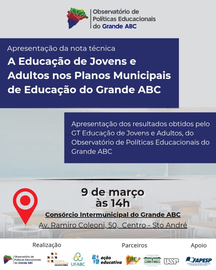 O Grupo de Trabalho que se debruça sobre as questões que envolvem a Educação de Jovens e Adultos (GT-EJA), do Observatório de Políticas Educacionais do Grande ABC, lançará na tarde do dia 9 de março de 2026 uma Nota Técnica que analisa a relação entre oferta e demanda da modalidade no Grande ABC. Também apresentará um painel de dados relativos ao tema. O evento será realizado das 14 às 18h na sede do Consórcio Intermunicipal Grande ABC, à Av. Ramiro Colleoni, 5 (próximo ao Paço Municipal de Santo André, ao lado do Colégio Singular).
